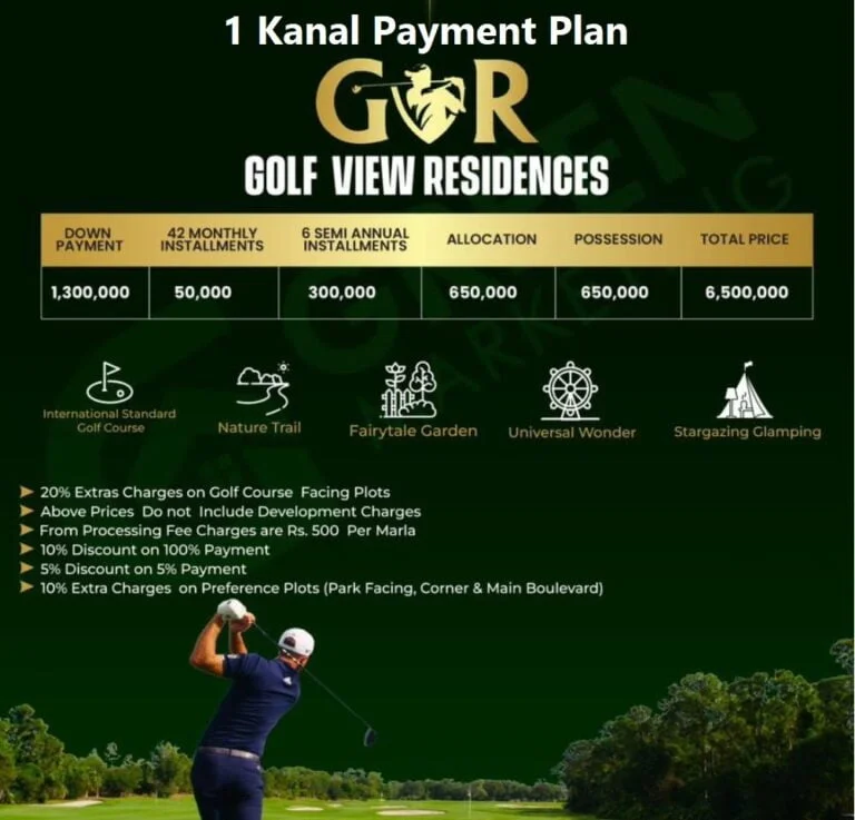 Here is most demanded one Kanal Plots Payment Plan in Golf View Residences of City Venture Block in Urban City Lahore. This is the payment plan of 1 kanal Golf Course Facing Plots in Urban City.