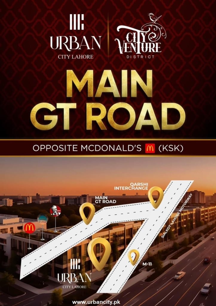 Urban City Lahore’s Commercial Block enjoys a prime location within the City Venture Block, strategically positioned on the bustling Main GT Road. This location offers unparalleled accessibility, being in close proximity to major landmarks such as the Kala Shah Kaku Interchange of the M2 Motorway. This interchange ensures seamless connectivity to Lahore and other major cities, making it a desirable hub for business and commerce. Additionally, the presence of popular fast-food outlets like McDonald’s and KFC in Kala Shah Kaku further enhances the commercial appeal of the area, attracting both local and passing visitors.