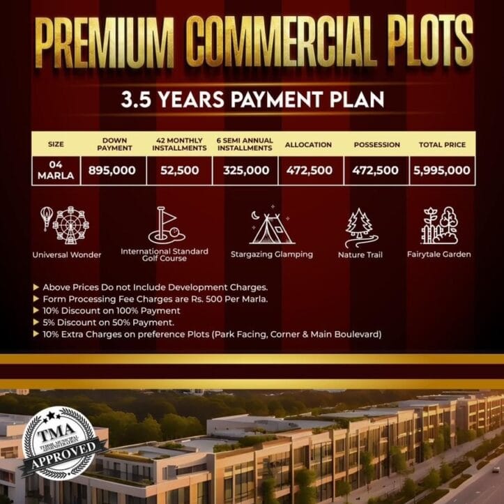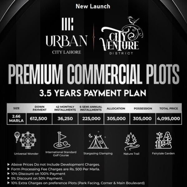 The Urban City Lahore commercial plot payment plan is meticulously designed to accommodate various financial capacities, ensuring that prospective investors can manage their investments with ease and clarity. Here are details of the payment plan for 4 marla commercial plot in City Venture Block of Urban City Lahore: