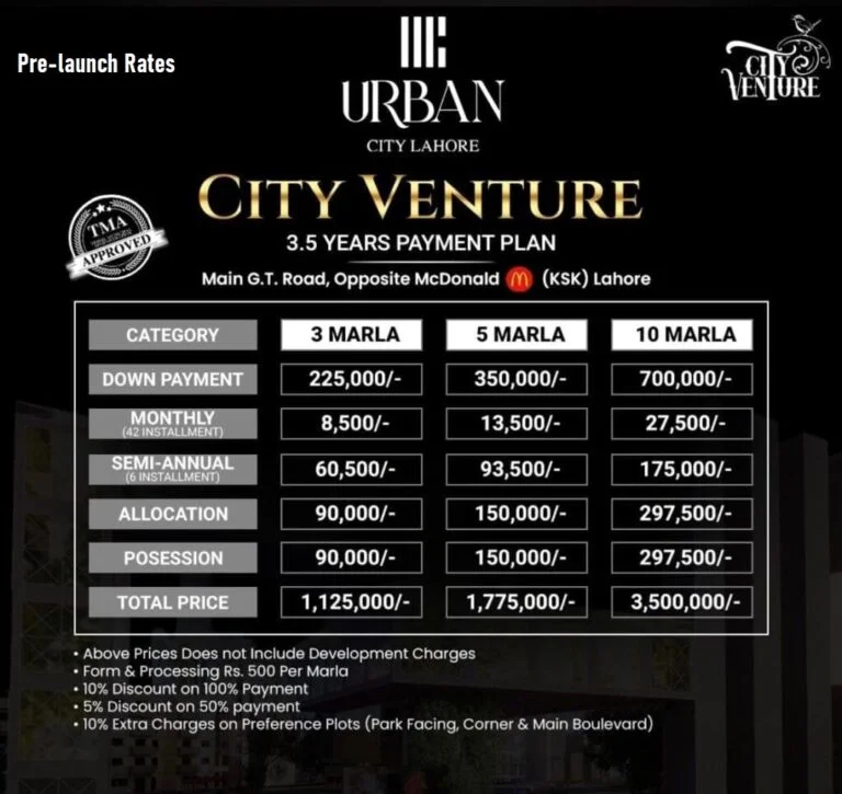 Buying a plot on instalments is easy as Urban City Lahore offers various plot sizes in residential and commercial category for booking on flexible payment plan. Here is the Instalments Payment Plan for City Venture District Located on Main GT Road – Urban City Lahore (2nd Booking). In Urban City Lahore you can book a plot on 3.5 year easy instalment plan. The possession of first block (City Oasis District) was given in 2 years while the possession of City Venture District Block will be given in 3 years. City Venture District block is located on main GT Road opposite to KFC Kala Shah Kaku & MacDonald’s KSK.